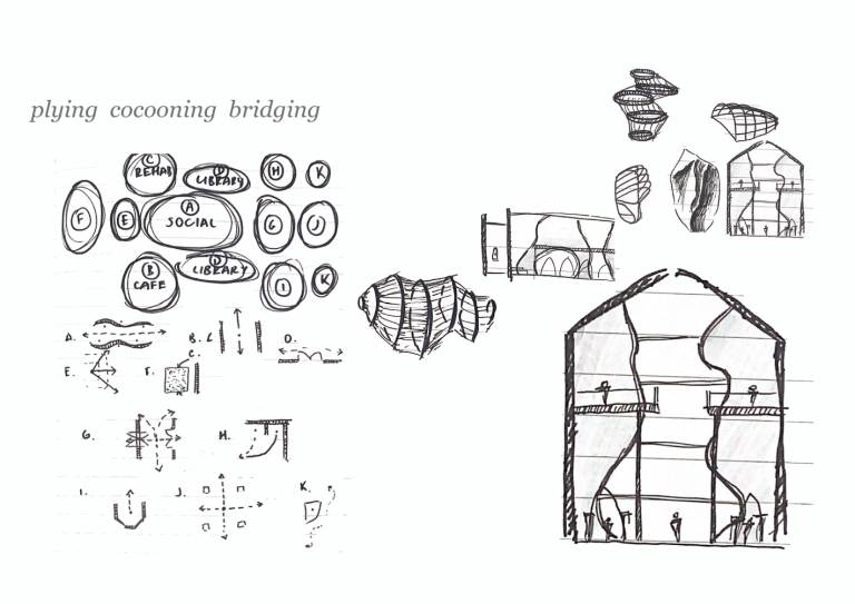 The design language that is utilised for this project derived from the initial concept of ‘cocooning’; an ironic statement that encourages elderly people to “go back” into the cocoon, a safe place where they are nurtured to grow within their physical, emotional and social wellbeing amongst like-minded people. This implies a skeletal form, comprised of organic and linear structures through using warm timbers that compliment that existing structure and its materiality. The materiality suggests cultural appreciation through the textures and colours used through each space/”cocoon”, which includes the variety of culture that exists within these Western suburbs of Sydney.