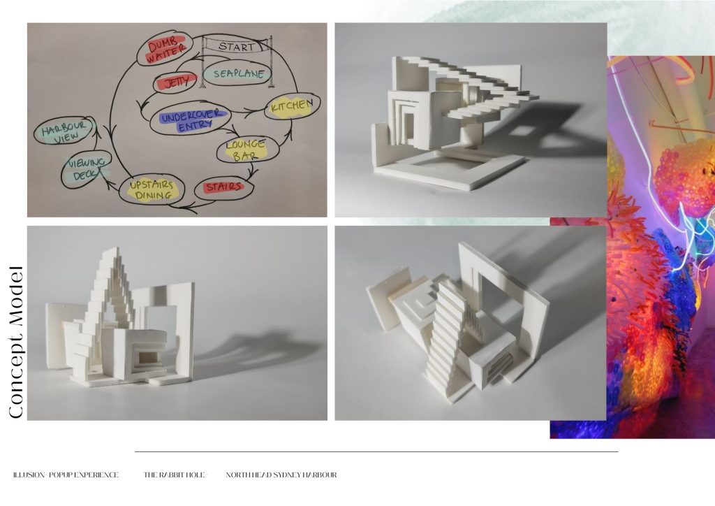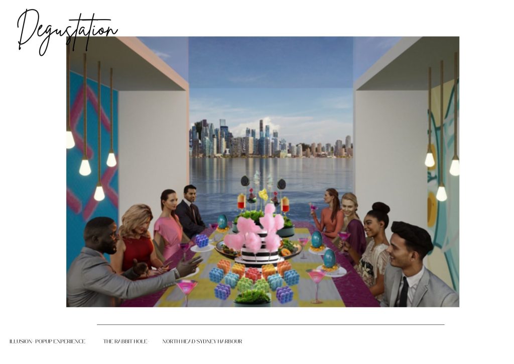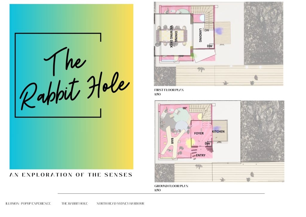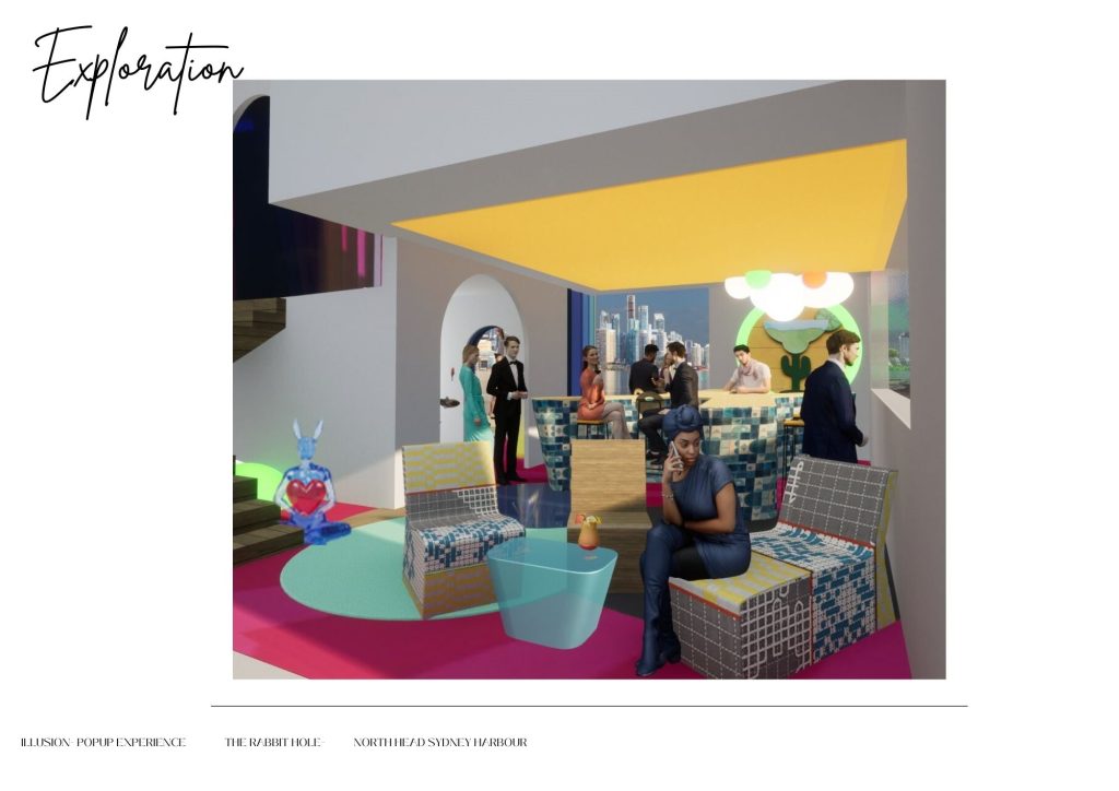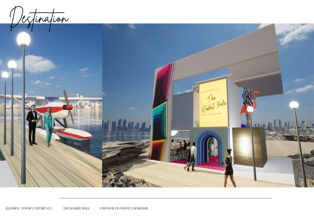 As an extension of the brand, we would like to take you on an unforgettable exploration of the senses. Arriving at your destination via sea plane and indulging in an interactive culinary experience heightening all senses. The concept reflected with the use of bold colours, piecing together unrelated forms in a fantasy like balance that creates a curious interior where things are not always as it seems. Please follow us down the Rabbit Hole…