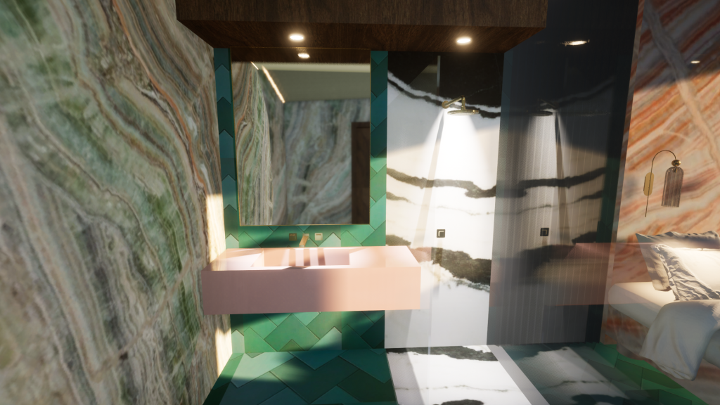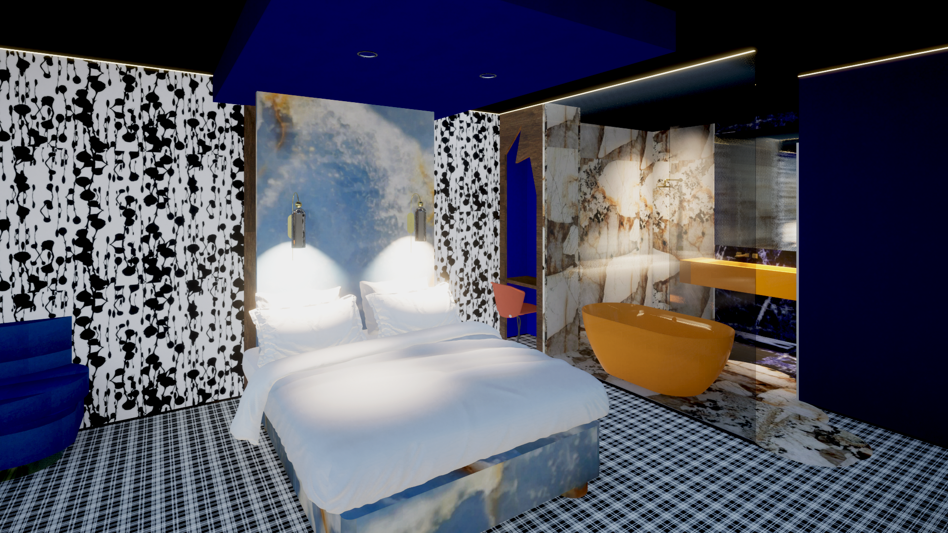 The Large Double bedroom uses an orange/blue complementary colour scheme, with a neutral black and white base and includes many different luxurious materials for guests to enjoy.
