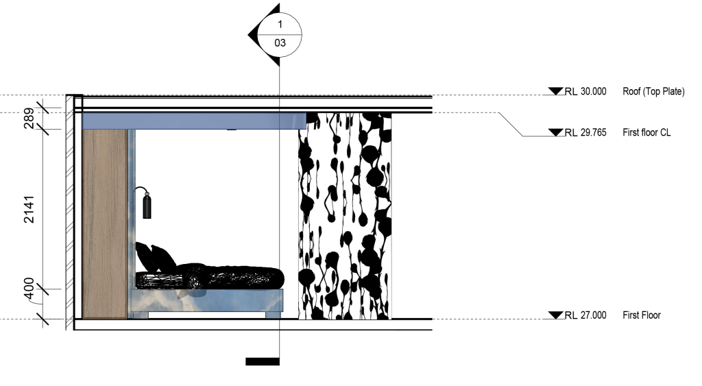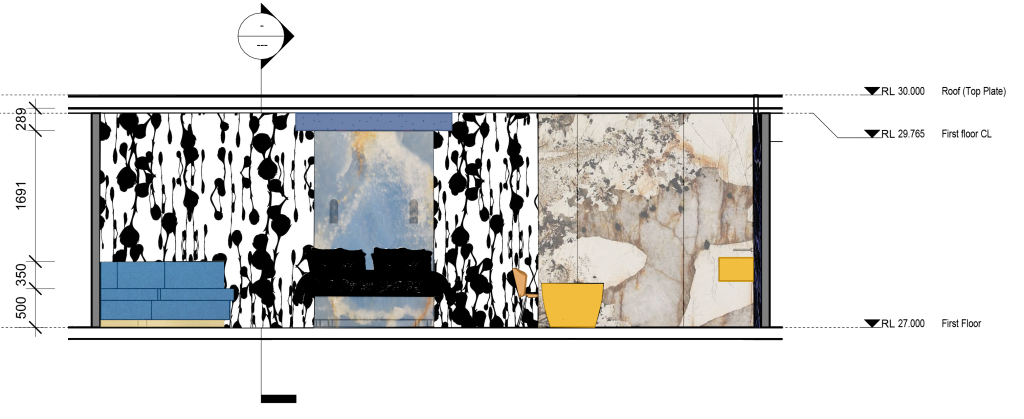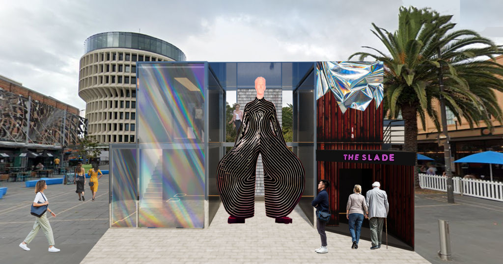 Designing around the “Glam Rock at Scale” concept, Liv created an exhibition space to showcase the many costumes from the Glam Rock era of music.  Playing with scale she created a giant 2 story high figure to attract visitors into the exhibition whilst reflecting the larger than life performers of the Glam Rock Era. Where the shipping containers are used, they remain unchanged, except above the entrance where there is a shining parasitic chrome form, evoking the unexpectedness of the overall concept.
